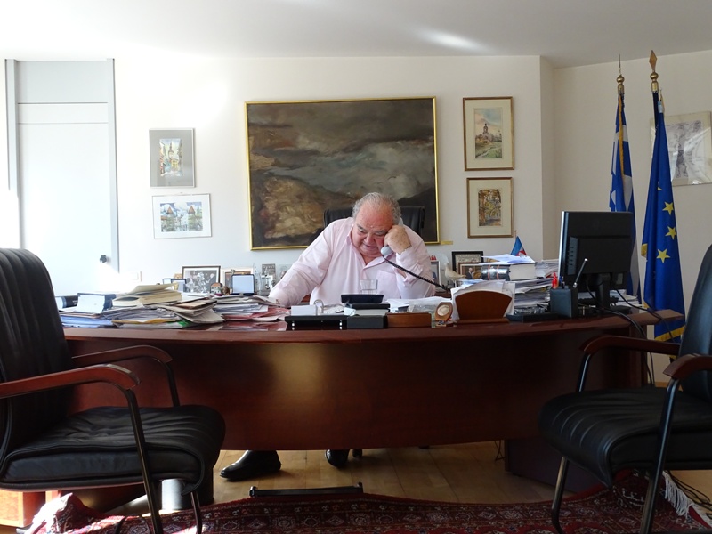 Ενώ συζητάμε, χτυπάει το τηλέφωνο, είναι ο πρόεδρος του ΕΟΠΠΥ. Κάτι λένε για μια ταμπέλα… «Για να δεις τι τρελοκομείο είναι η Ελλάδα. Στο Λαϊκό Νοσοκομείο υπάρχει ένα γραφείο του ΕΟΠΠΥ που εγκρίνει τα νοσηλεία. Στην πόρτα η ταμπέλα γράφει: “ιατρός του ΕΟΠΠΥ 10:00-12:00”. Τις προάλλες ήρθε εδώ κόσμος διαμαρτυρόμενος ότι περιμένει δύο ώρες και ο γιατρός δεν εμφανίζεται. Στείλαμε λοιπόν έγγραφο στον ΕΟΠΠΥ και μόλις μίλησα με τον Διοικητή ο οποίος μου λέει: “’Έχει καταργηθεί ο γιατρός, απλά δεν έχουμε βγάλει ακόμα την ταμπέλα”. Μα είναι δυνατόν; Βγάλε την ταμπέλα! Γιατί να κάθεται ο κόσμος να περιμένει; Και μου λέει “ειδοποιώ τις υπηρεσίες να πάνε να τη βγάλουνε και δεν πάνε”. Αυτό το χάος είναι η Ελλάδα. Στην Ελλάδα πρέπει να παλεύεις για τα αυτονόητα».