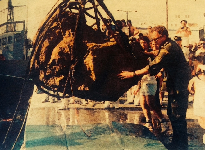 Παρά τις αντιρρήσεις των αρχαιολόγων και της τότε υπουργού Πολιτισμού Μελίνας Μερκούρη που ήταν και καθ ύλην αρμόδιοι το Υπουργείο Ναυτιλίας προχώρησε στις αρχές Ιουλίου στην ανάσυρση της “γροθιάς” του Κολοσσού από το σημείο που είχε υποδείξει η Ολλανδή οραματίστρια. Συγκεκριμένα βατραχάνθρωποι του Λιμενικού με επικεφαλής τον πλοίαρχο Α. Πετρίδη χρησιμοποίησαν το σκάφος “Ποσειδών” για την ανάσυρση του ευρήματος το οποίο τοποθετήθηκε στο λιμάνι του νησιού. Σε συνέντευξη Τύπου που δόθηκε πάνω στο “Ποσειδών” και αφού τονίσθηκε ότι τώρα είναι δουλειά των αρχαιολόγων – οι οποίοι μέχρι τότε είχαν αποκλειστεί από την ανέλκυση – να εκτιμήσουν το εύρημα ο Υπουργός Εμπορικής Ναυτιλίας ανέφερε ότι θα εντατικοποιηθούν έρευνες στον βυθό καθώς έχει εντοπισθεί ένα ακόμη εύρημα που μοιάζει με κεφαλή που της λείπει η μύτη. Οι ανακοινώσεις του Αλεξανδρή ήταν η αφορμή να κάνει την επανεμφάνιση της πανηγυρικά η Ντάκμααρ η οποία δήλωνε πλέον στους δημοσιογράφους: “Μέχρι το Σεπτέμβριο θα έχουν ολοκληρωθεί οι έρευνες. Στο βυθό υπάρχει ακόμη το χέρι του Κολοσσού, το ένα πόδι και σε μεγαλύτερο βάθος και άλλα κομμάτια από το σώμα του. Η γροθιά που βρέθηκε τώρα ήταν ακριβώς στο σημείο που ακριβώς υπέδειξα. Η υπόθεση του Κολοσσού θα δώσει μεγάλη ευημερία στο νησί εγώ όμως θα χάσω την ησυχία μου”.