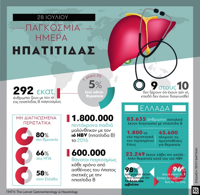 Στην Ελλάδα υπολογίζεται ότι 200.000 άνθρωποι είναι φορείς της ηπατίτιδας Β. Όσον αφορά στην ηπατίτιδα C εκτιμάται ότι περισσότερα από 100.000 άτομα πάσχουν στη χώρα μας, εκ των οποίων 75.000 δεν το γνωρίζουν. Τα στοιχεία αυτά έδωσε στη δημοσιότητα ο Εθνικός Οργανισμός Δημόσιας Υγείας (ΕΟΔΥ) με αφορμή την 28η Ιουλίου που έχει καθιερωθεί ως Παγκόσμια Ημέρα Ηπατίτιδας.