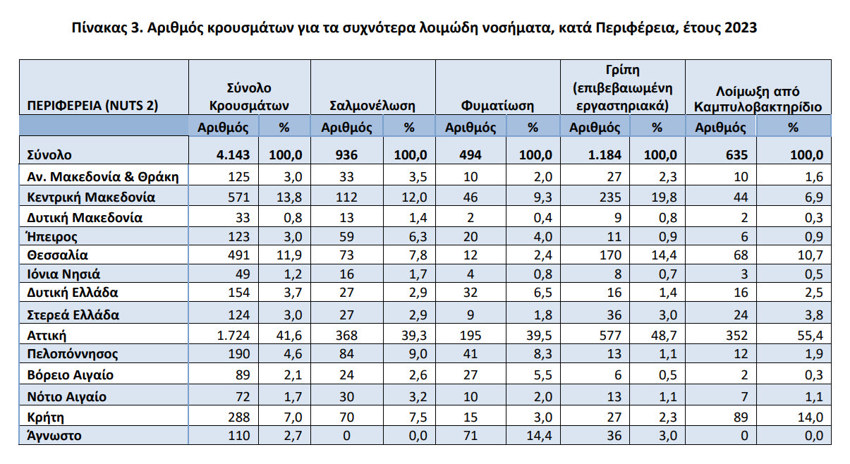 - Σαλμονέλωση: Οι περισσότερες περιπτώσεις καταγράφηκαν στην Αττική (39,3%), ακολουθούμενη από την Κεντρική Μακεδονία (12%) και την Πελοπόννησο (9%).