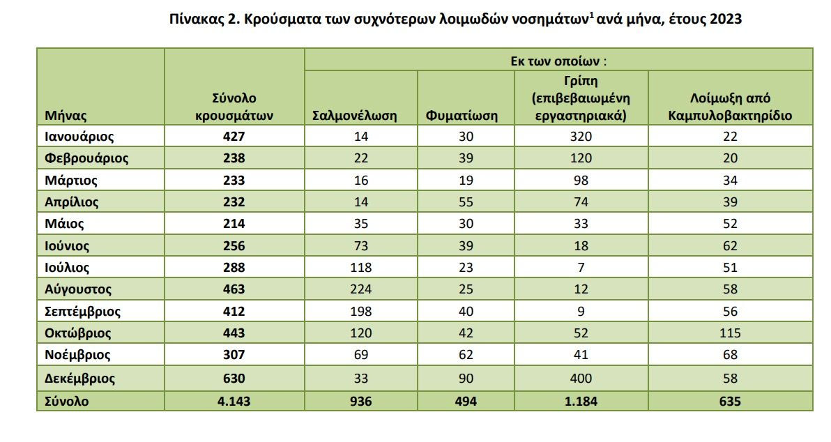 Σύμφωνα πάντα με την ΕΛΣΤΑΤ, ο συνολικός αριθμός κρουσμάτων λοιμωδών νοσημάτων ανήλθε σε 4.143, καταγράφοντας αύξηση 16,3% σε σχέση με το 2022.
