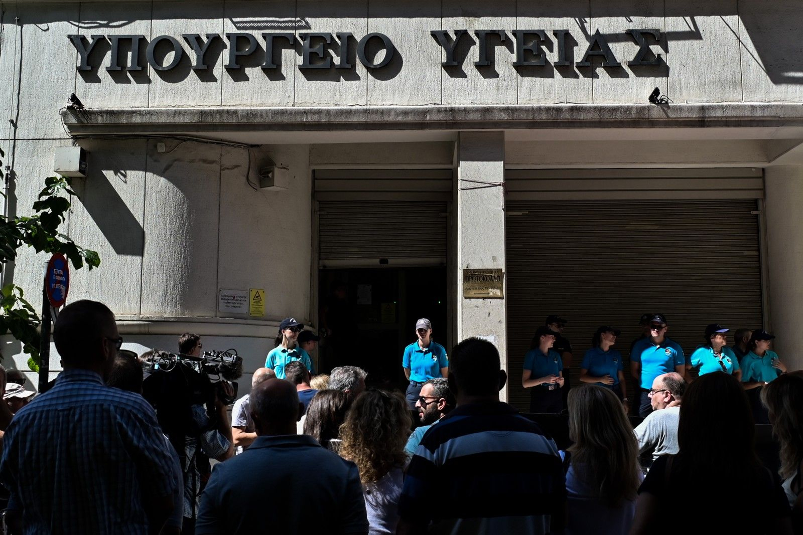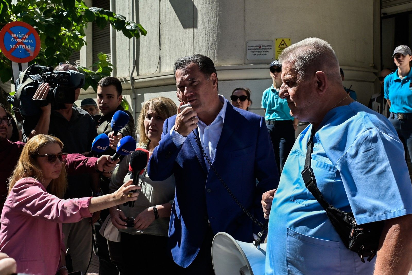 Ο υπουργός Υγείας Άδωνις Γεωργιάδης κατέβηκε να δει τους συγκεντρωμένους και αρχικά θέλησε να τους ευχαριστήσει για τη δουλειά που κάνουν.