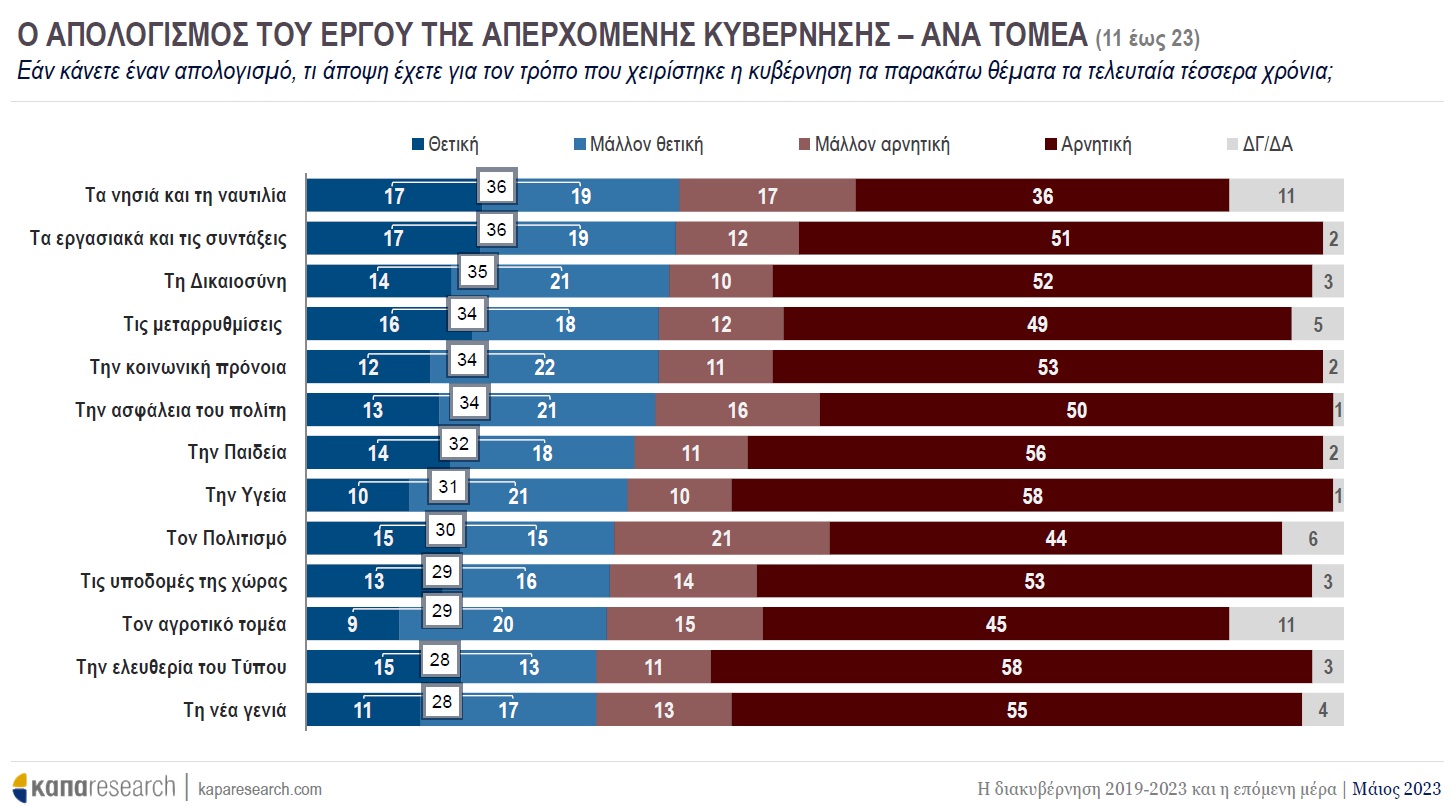 Όσον αφορά την αρνητική άποψη από τους χειρισμούς της απερχόμενης κυβέρνησης, το ίδιο ποσοστό (58%) εκφράζει τη δυσαρέσκειά του για το θέμα της ελευθερίας του Τύπου, ενώ για τα θέματα της Παιδείας αρνητική ήταν η αντίδραση του 56% των πολιτών.