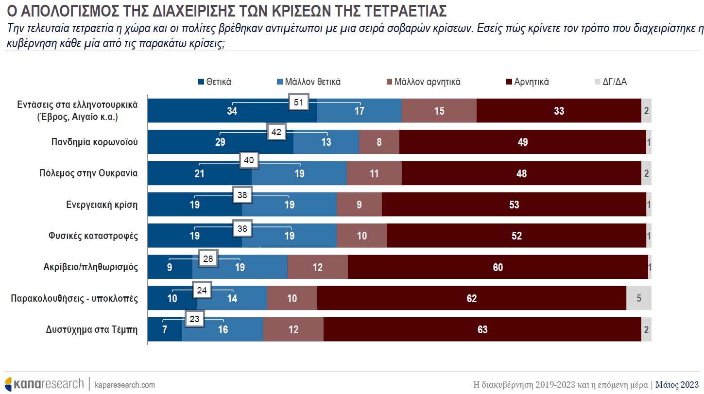 Απαντώντας στην ερώτηση «την τελευταία τετραετία η χώρα και οι πολίτες βρέθηκαν αντιμέτωποι με μια σειρά σοβαρών κρίσεων. Εσείς πώς κρίνετε τον τρόπο που διαχειρίστηκε η κυβέρνηση κάθε μία από τις παρακάτω κρίσεις;», το 49% κρίνει αρνητικά τους χειρισμούς της κυβέρνησης και το 29% θετικά.