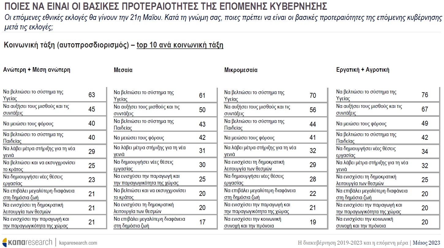 Μάλιστα, η βελτίωση του συστήματος υγείας είναι η πρώτη ανάγκη σε όλες τις κοινωνικές και οικονομικές τάξεις, όπως προκύπτει από τη δημοσκόπηση της Κάπα Research.