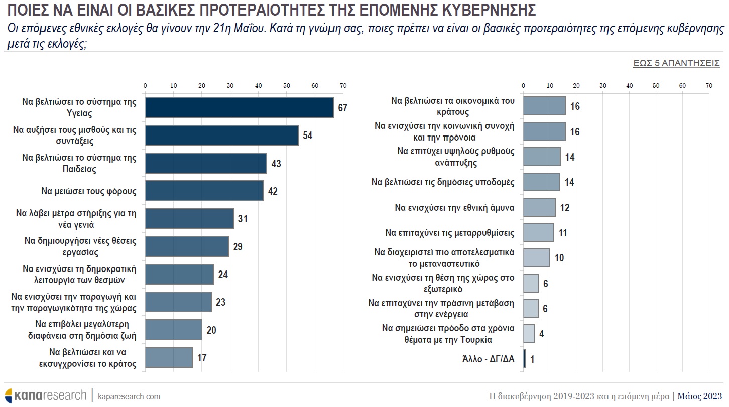 Στην ίδια δημοσκόπηση και στην ερώτηση «κατά τη γνώμη σας, ποιες πρέπει να είναι οι βασικές προτεραιότητες της επόμενη ς κυβέρνησης», οι πολίτες βάζουν σε πρώτη προτεραιότητα την Υγεία.