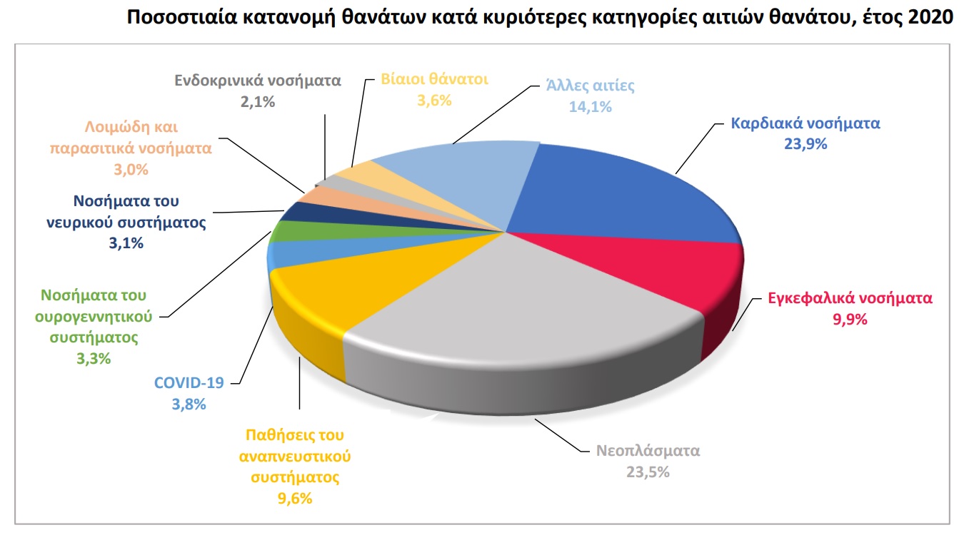 Συγκεκριμένα, το 2020 έχασαν τη ζωή τους 131.0251 (66.162 άντρες και 64.863 γυναίκες) πολίτες στη χώρα μας, ενώ το προηγούμενο έτος είχαν πεθάνει 124.954 (63.079 άντρες και 61.875 γυναίκες) άτομα.