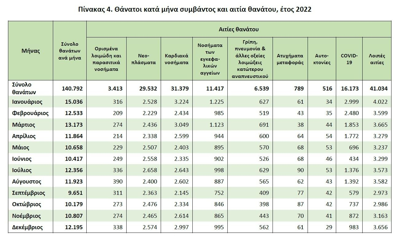 Ακολουθούν οι θάνατοι από νεοπλάσματα (29.532), από τη λοίμωξη COVID-19 (16.173) και οι θάνατοι που οφείλονται σε παθήσεις του αναπνευστικού συστήματος (13.165).