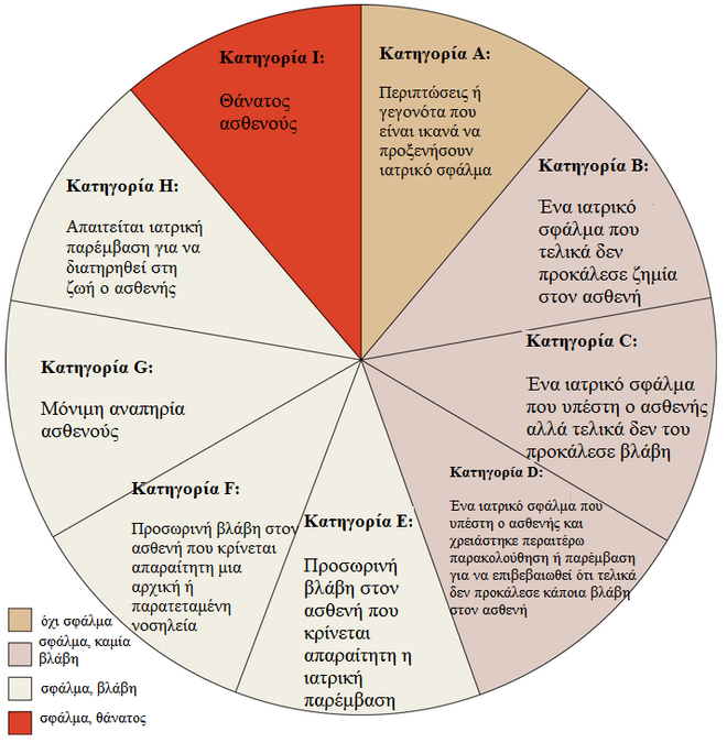 Το επίπεδο της βαρύτητας των πιθανών βλαβών κυμαίνεται από το καμία βλάβη στον ασθενή (κατηγορίες Α έως D) μέχρι την προκληθείσα προσωρινή βλάβη, μόνιμη αναπηρία ή θάνατο (κατηγορίες Ε έως I). Για πιο αναλυτική παρουσίαση, παρατίθεται το παρακάτω διάγραμμα, το οποίο αποτελεί μια διαμορφωμένη μορφή ταξινόμησης της βαρύτητας των ανεπιθύμητων περιστατικών: