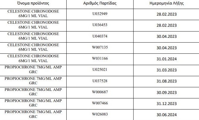 Στην ανάκληση παρτίδων των ενέσιμων κορτικοστεροειδών φαρμακευτικών προϊόντων “CELESTONE CHRONODOSE INJ.SU.RET (3+3)MG/1 ML VIAL και PROPIOCHRONE INJ.SUSP (5+2)MG/1ML προχώρησε ο Εθνικός Οργανισμός Φαρμάκων (ΕΟΦ).