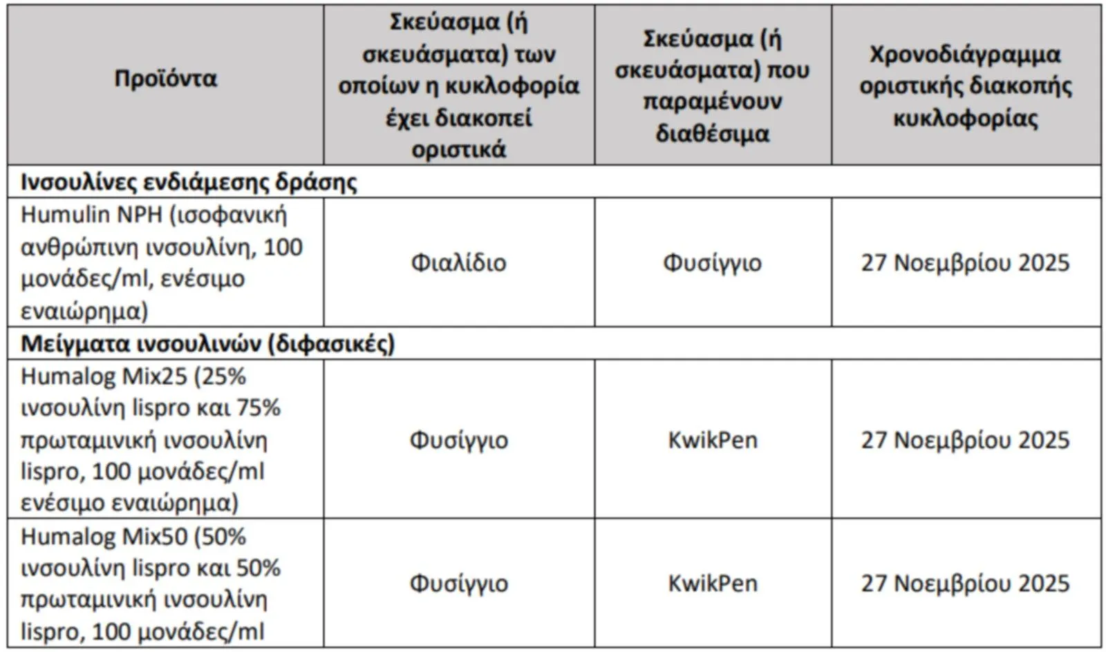 Υπογραμμίζει πως η ΦΑΡΜΑΣΕΡΒ ΛΙΛΛΥ Α.Ε.Β.Ε. έχει ήδη προχωρήσει στην οριστική διακοπή κυκλοφορίας των παρακάτω σκευασμάτων ινσουλίνης στην Ελλάδα. Υπάρχουν εναλλακτικές επιλογές θεραπείας για τα περισσότερα σκευάσματα ινσουλίνης των οποίων η κυκλοφορία πρόκειται να διακοπεί οριστικά, τονίζει και προσθέτει πως οι οριστικές διακοπές κυκλοφορίας δεν οφείλονται σε ζητήματα ασφάλειας, αποτελεσματικότητας ή ποιότητας.