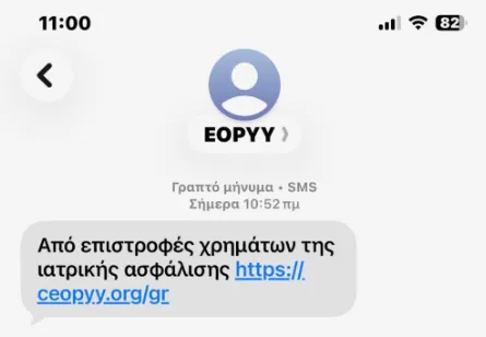 Ειδικότερα η Διοίκηση του Οργανισμού σημειώνει ότι τα εν λόγω μηνύματα εμφανίζονται ως ειδοποιήσεις που φαινομενικά προέρχονται από τον Εθνικό Οργανισμό Παροχής Υπηρεσιών Υγείας (ΕΟΠΥΥ) και υπόσχονται επιστροφή χρημάτων στους παραλήπτες.