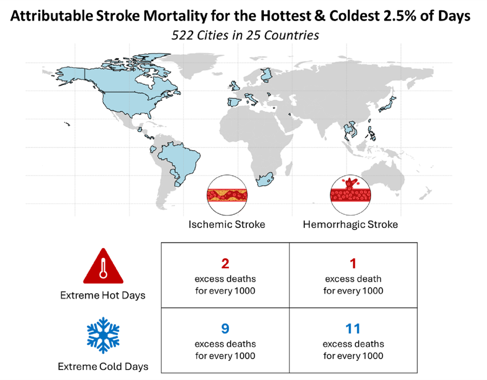 Στη μεγαλύτερη έρευνα που έχει γίνει μέχρι σήμερα σε παγκόσμιο επίπεδο, για τη διερεύνηση της σχέσης μεταξύ ακραίων θερμοκρασιών και θανάτου από εγκεφαλικά επεισόδια, μια ομάδα ερευνητών με επικεφαλής τη Σχολή Δημόσιας Υγείας T.H.Chan του Πανεπιστημίου του Χάρβαρντ εντόπισε ότι σε κάθε 1.000 θανάτους από ισχαιμικό ή αιμορραγικό εγκεφαλικό, περίπου οι έντεκα αποδίδονται στο ακραίο κρύο ή την ακραία ζέστη.