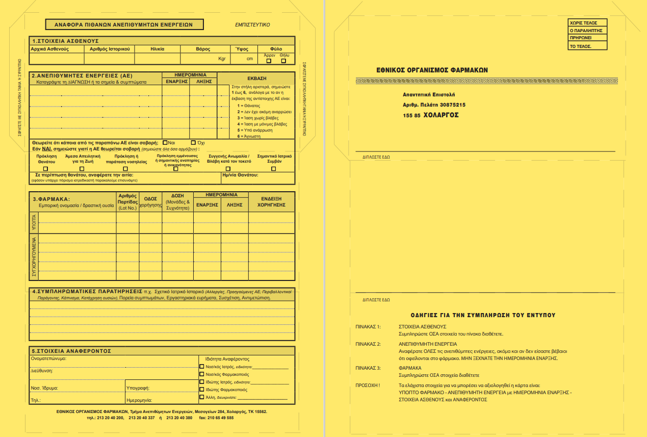 Πρόκειται για την ειδική κάρτα, η οποία αποτελεί βασικό μέσο για τη συλλογή πληροφοριών, σχετικά με τις ανεπιθύμητες ενέργειες των φαρμάκων και των εμβολίων.