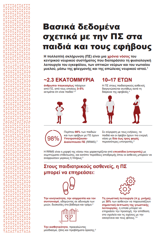 Η πολλαπλή σκλήρυνση (ΠΣ) είναι μια χρόνια νόσος του κεντρικού νευρικού συστήματος (ΚΝΣ) που διαταράσσει τη φυσιολογική λειτουργία του εγκεφάλου, των οπτικών νεύρων και του νωτιαίου μυελού, μέσω της φλεγμονής και της απώλειας νευρικού ιστού3. Στους ενήλικες, υπάρχουν τρεις κύριοι τύποι ΠΣ: η Υποτροπιάζουσα-Διαλείπουσα ΠΣ (RRMS), η Δευτεροπαθώς Προϊούσα ΠΣ (SPMS) και η Πρωτοπαθώς Προϊούσα ΠΣ (PPMS)4. Περίπου 85% των ανθρώπων με ΠΣ πάσχουν από Υποτροπιάζουσα-Διαλείπουσα ΠΣ, όπου το ανοσοποιητικό σύστημα επιτίθεται στον υγιή νευρικό ιστό5. Στα παιδιά, σχεδόν σε όλες τις περιπτώσεις (περίπου 98%) εμφανίζεται με τη μορφή της RRMS6.