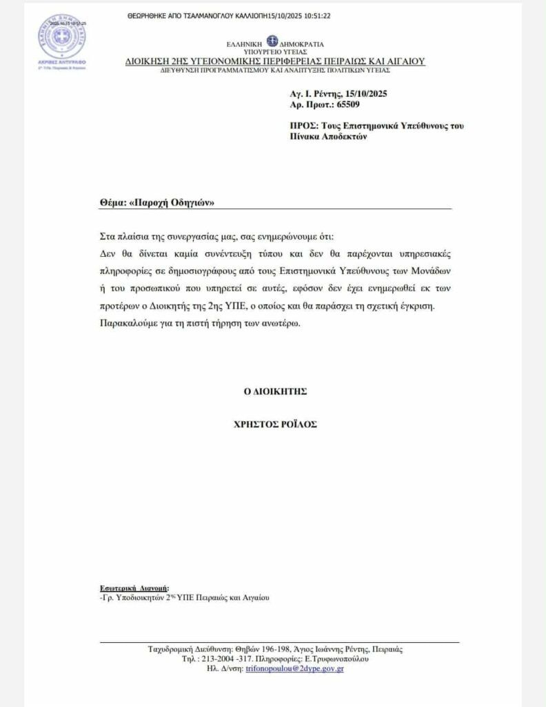 Με έγγραφη εντολή προς εργαζομένους σε νοσοκομεία του ΕΣΥ, η 2η Υγειονομική Περιφέρεια απαιτεί τη φίμωση των υγειονομικών.