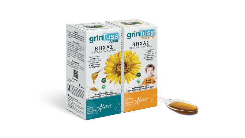 Ολοένα και περισσότερα άτομα επιλέγουν το Grintuss γιατί καταπραΰνει τον ξηρό και παραγωγικό βήχα, προστατεύοντας τον βλεννογόνο. Περιέχει Poliresin®, φυτικό μοριακό σύμπλεγμα ρητινών, πολυσακχαριτών και φλαβονοειδών. Το Grintuss είναι ένα προϊόν με βάση το μέλι και μοριακά σύμπλοκα που έχει προστατευτική και επομένως καταπραϋντική δράση στις ανώτερες αναπνευστικές οδούς. Δρα στον ξηρό βήχα αντιμετωπίζοντας τον ερεθισμό του βλεννογόνου και στον παραγωγικό βήχα ευνοώντας την ενυδάτωση και την αποβολή της βλέννας. Το Grintuss είναι ένα προϊόν με συστατικά βιολογικής γεωργίας, χωρίς γλουτένη και με ευχάριστη γεύση. Το Grintuss adult ενδείκνυται για τη θεραπεία του βήχα, τόσο ξηρού όσο και παραγωγικού, σε ενήλικες και παιδιά από 12 ετών. Το Grintuss pediatric είναι κατάλληλο και για παιδία από 1 έτους.