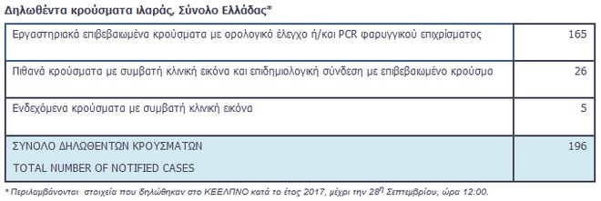 Μέχρι σήμερα, στην Ελλάδα έχουν καταγραφεί 196 κρούσματα ιλαράς, με μεγαλύτερη συχνότητα στη Νότια Ελλάδα. Στη μεγάλη πλειονότητα πρόκειται για άτομα ελληνικής υπηκοότητας, κυρίως μικρά παιδιά από κοινότητες Ρομά και άτομα από το γενικό πληθυσμό κυρίως στην ηλικιακή ομάδα 25-44 ετών, που δεν έχουν ανοσία στην ιλαρά, μεταξύ των οποίων και επαγγελματίες υγείας που ήταν ανεμβολίαστοι ή ατελώς εμβολιασμένοι.