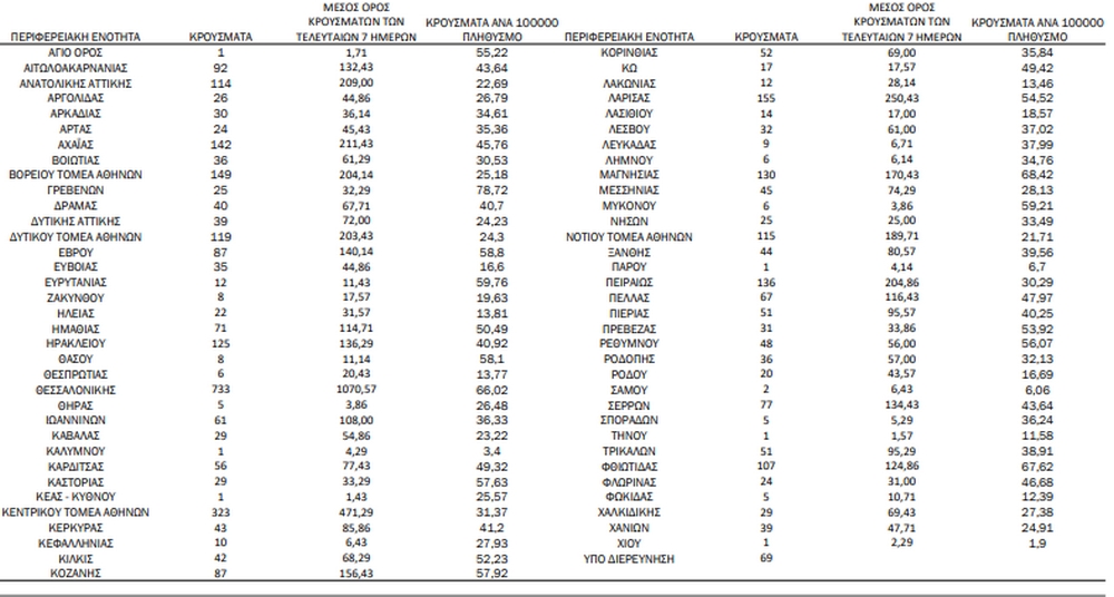 Αναλυτικά η διασπορά των νέων κρουσμάτων σήμερα στην υπόλοιπη Ελλάδα
