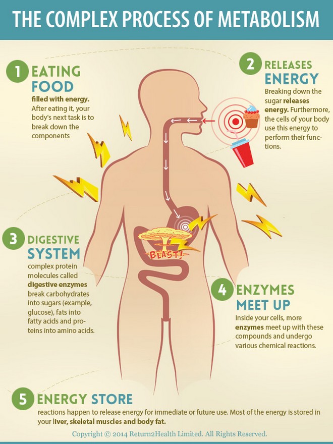 Το σώμα δουλεύει σκληρά για να μπορέσει να απελευθερώσει τα «καύσιμα» από τις τροφές και να τα μετατρέψει σε ενέργεια. Η διαδικασία παραγωγής ενέργειας από τα συστατικά των τροφών ονομάζεται μεταβολισμός και αποτελείται από χιλιάδες χημικά μονοπάτια. Ο μεταβολισμός είναι μία ασταμάτητη διεργασία απαραίτητη για να συντηρηθεί το ανθρώπινο σώμα στη ζωή και να επιτελέσει από τις πιο απλές, μέχρι τις πλέον πολύπλοκες λειτουργίες του.