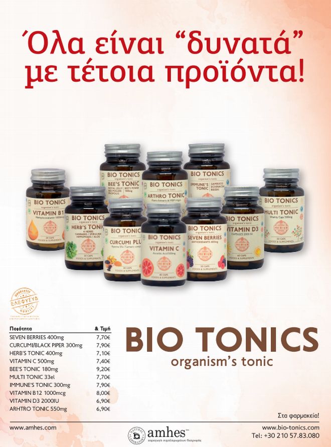 Τα προϊόντα BIO TONICS, παράγονται από την Ελληνική Εταιρία Φυσικών Συμπληρωμάτων Διατροφής AMHES