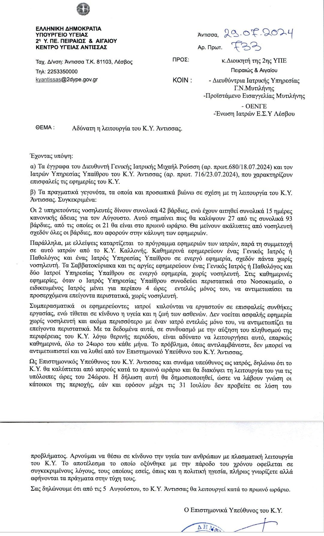Με νέο έγγραφό του προς τον διοικητή της 2ης Υγειονομικής Περιφέρειας (ΥΠΕ) στις 29 Ιουλίου (έγγραφο το οποίο κοινοποιείται στην ΟΕΝΓΕ αλλά και στην Εισαγγελία Μυτιλήνης) ο επιστημονικά υπεύθυνος του Κέντρου Υγείας (ΚΥ) Άντισσας Λέσβου επανέρχεται για πολλοστή φορά στις τραγικές ελλείψεις ιατρικού, νοσηλευτικού και λοιπού προσωπικού που πλέον καθιστούν πλήρως επισφαλή την εφημέρευση του ΚΥ και δηλώνει ότι από 5 Αυγούστου το ΚΥ θα λειτουργεί μόνο κατά το πρωινό ωράριο χωρίς να εφημερεύει, σύμφωνα με την Ομοσπονδία Ενώσεων Νοσοκομειακών Γιατρών Ελλάδας (ΟΕΝΓΕ).