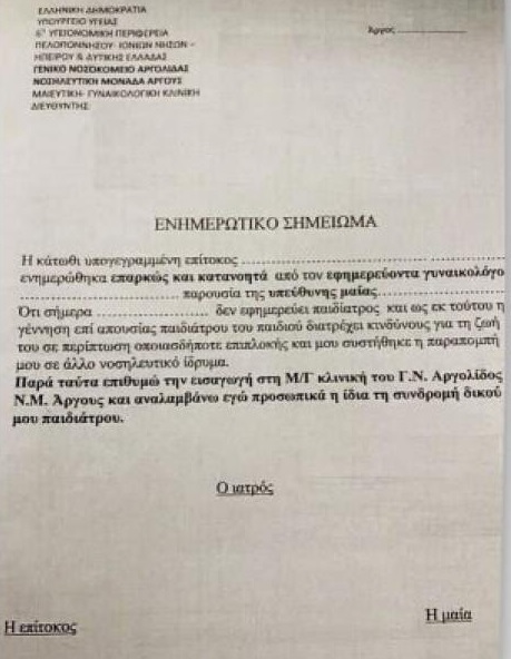 «Η κάτωθι υπογεγραμμένη επίτοκος ενημερώθηκα επαρκώς και κατανοητά από τον εφημερεύοντα γυναικολόγο παρουσία της υπεύθυνης μαίας ότι σήμερα δεν εφημερεύει παιδίατρος και ως εκ τούτου η γέννηση επί απουσίας παιδιάτρου του παιδιού διατρέχει κινδύνους για τη ζωή του σε περίπτωση οποιασδήποτε επιπλοκής και μού συστήθηκε η παραπομπή σε άλλο νοσηλευτικό ίδρυμα. Παρά ταύτα, επιθυμώ την εισαγωγή στη Μαιευτική Γυναικολογική κλινική του Γενικού Νοσοκομείου Αργολίδος ΝΜ Αργους και αναλαμβάνω εγώ προσωπικά τη συνδρομή δικού μου παιδιάτρου».