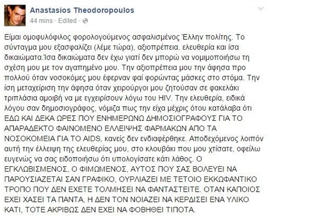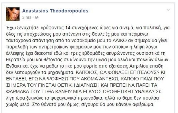 “Έχω ξενυχτήσει γράφοντας 14 συνεχόμενες ώρες για σινεμά, για πολιτική, για όλες τις υποχρεώσεις μου απέναντι στις δουλειές μου και περιμένω ταυτόχρονα απάντηση από το νοσοκομείο μου το ΛΑΪΚΟ αν σήμερα θα γίνει παραλαβή των αντιρετροίκών φαρμάκων μου των οποίων η λήψη λόγω έλλειψης έχει διακοπεί εδώ και τρεις εβδομάδες ακυρώνοντας ουσιαστικά τη θεραπεία μου και θέτοντας σε κίνδυνο την υγεία μου αλλά και πολλών άλλων”, αναφέρει χαρακτηριστικά σε ανάρτηση του στην προσωπική του ιστοσελίδα στο Facebook.