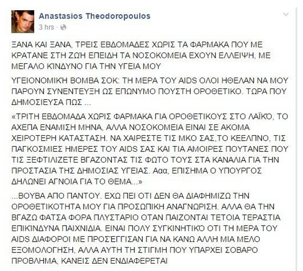 “Ενδεικτικά, έχω να μάθω το ιικό μου φορτίο από εξετάσεις Απριλίου επειδή δεν λειτουργούν τα μηχανήματα. ΚΑΠΟΙΟΣ, ΘΑ ΦΩΝΑΞΕΙ ΕΠΙΤΕΛΟΥΣ? KI ENTAΞΕΙ, ΕΓΩ ΝΑ ΨΟΦΗΣΩ ΠΟΥ ΑΚΟΜΑ ΑΝΤΕΧΩ, ΚΑΠΟΙΟ ΠΑΙΔΙ ΠΟΥ ΣΗΜΕΡΑ ΤΟΥ ΓΙΝΕΤΑΙ ΘΕΤΙΚΗ ΔΙΑΓΝΩΣΗ ΚΑΙ ΠΡΕΠΕΙ ΝΑ ΠΑΡΕΙ ΤΑ ΦΑΡΜΑΚΑ ΤΟΥ ΤΙ ΘΑ ΚΑΝΕΙ? MIA EΓΚΥΟΣ ΟΡΟΘΕΤΙΚΗ ΓΥΝΑΙΚΑ? Σε λίγη ώρα ξεκινάνε τα ψυχαγωγικά πρωινάδικα, αλλά το θέμα δεν πουλάει χωρίς μελό. Στο θάνατό μου όμως, σίγουρα θα μου κάνουν αφιέρωμα”, γράφει, εκφράζοντας μια κραυγή αγωνίας των ανθρώπων που έχουν ανάγκη τα φάρμακα για την αντιρετροϊκή αγωγή τους.