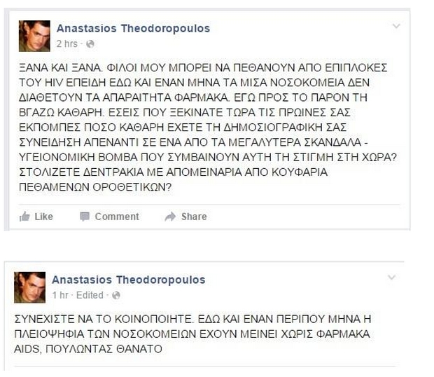 Μήνυμα αγωνίας από τον δημοσιογράφο Τάσο Θεοδωρόπουλο που αναφέρει πως δεν υπάρχουν τα φάρμακα της αντιρετροϊκής αγωγής στα νοσοκομεία της χώρας με αποτέλεσμα να κινδυνεύει η ζωή εκατοντάδων ανθρώπων