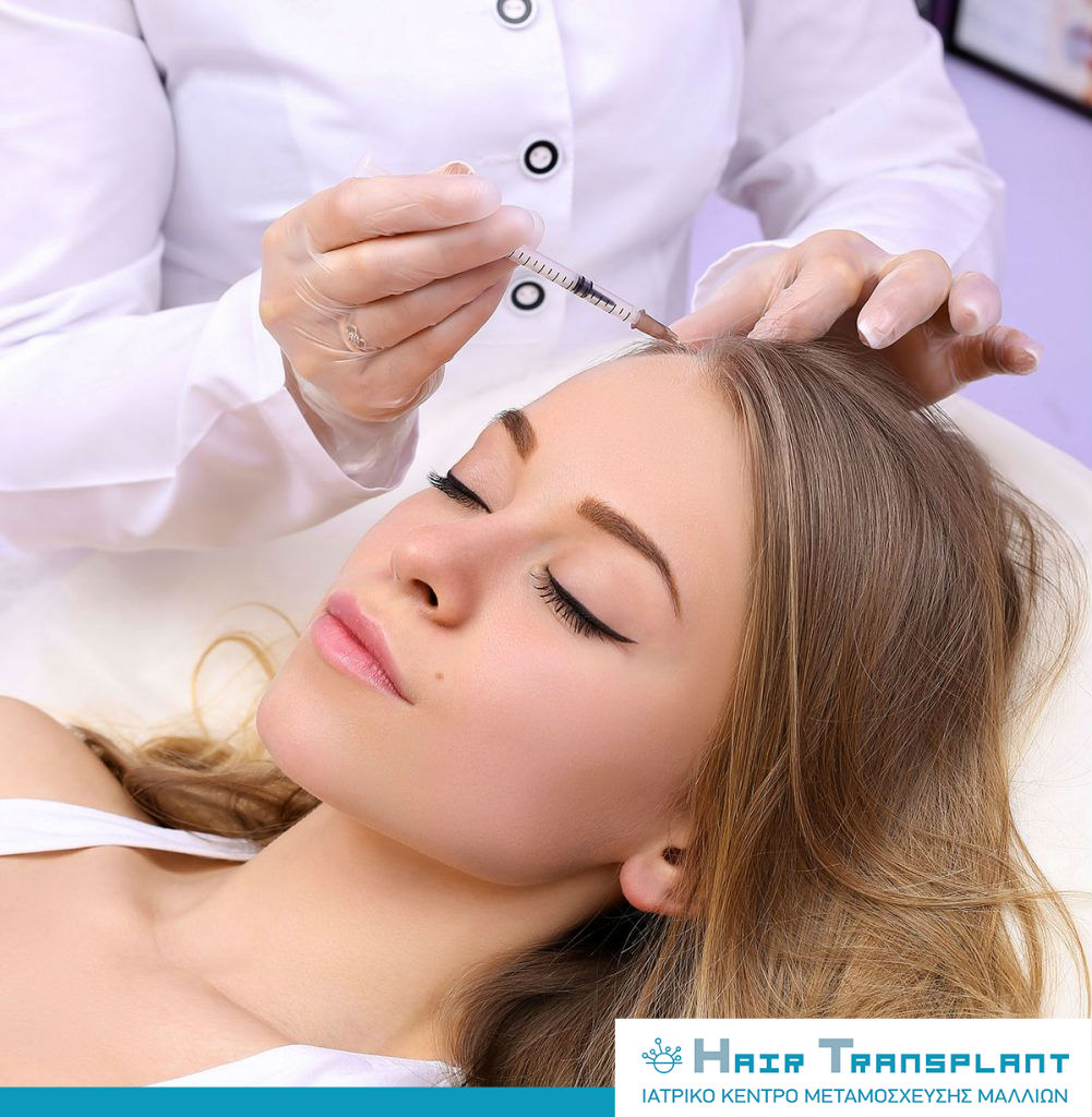 Αφού διαπιστωθεί ο τύπος της τριχόπτωσης (ανδρογενετική, διάχυτος, ουλωτική, γυροειδής) , τότε επιλέγονται τα κατάλληλα πολυβιταμινούχα φάρμακα  μέταλλα, ιχνοστοιχεία, αντιοξειδωτικές ουσίες σε συνδυασμό με φαρμακευτικές ουσίες, όπως μινοξιδίλη, στεροειδή κλπ. που θα εγχυθούν στις προβληματικές περιοχές. Σε διάρκεια 8 μηνών, φαίνονται τα αποτελέσματα, χωρίς καμία παρενέργεια.  Η θεραπεία γίνεται σε συνεννόηση με τον γιατρό, είναι ανώδυνη, λόγω της χρήσης πολύ λεπτής βελόνης (32G) σαν τρίχα από τις βλεφαρίδες μας, και χωρίς παρενέργειες ο ασθενής επιστρέφει στις δραστηριότητές του αμέσως μετά τη θεραπεία. Από την πρώτη κιόλας θεραπεία, παρατηρούμε μείωση της τριχόπτωσης, στην συνέχεια σταθεροποίηση και ενδυνάμωση και αργότερα επανέκφυση.