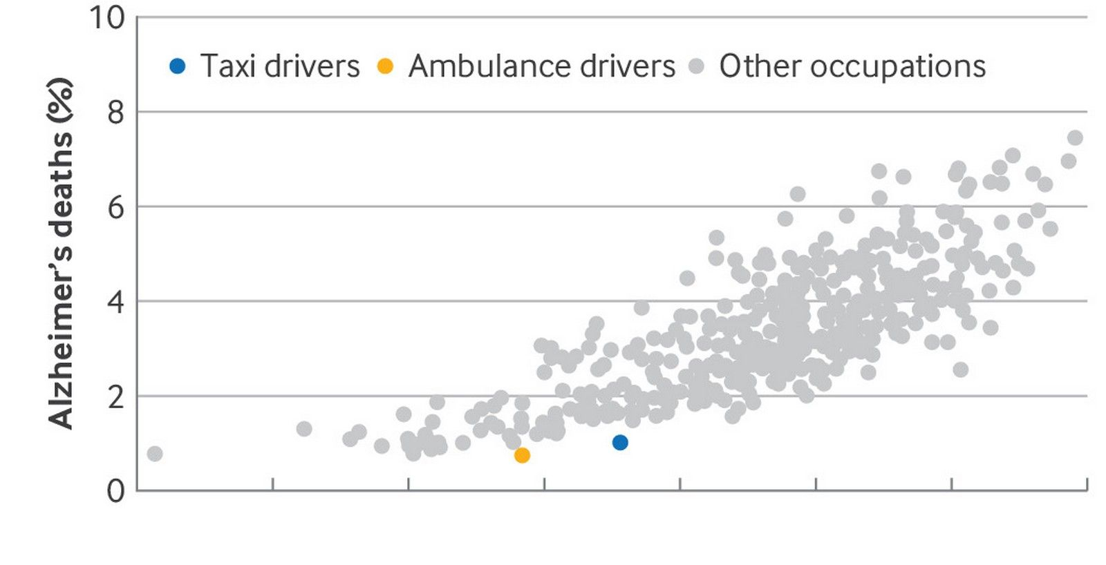 Υποθέσαμε ότι επαγγέλματα, όπως η οδήγηση ταξί και η οδήγηση ασθενοφόρου, που απαιτούν χωρική και πλοήγηση σε πραγματικό χρόνο, μπορεί να σχετίζονται με μειωμένη επιβάρυνση της θνησιμότητας από τη νόσο του Αλτσχάιμερ, σε σύγκριση με άλλα επαγγέλματα».